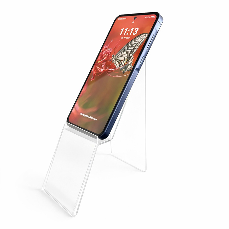 Suport pentru telefon mobil realizat din plexiglas transparent.